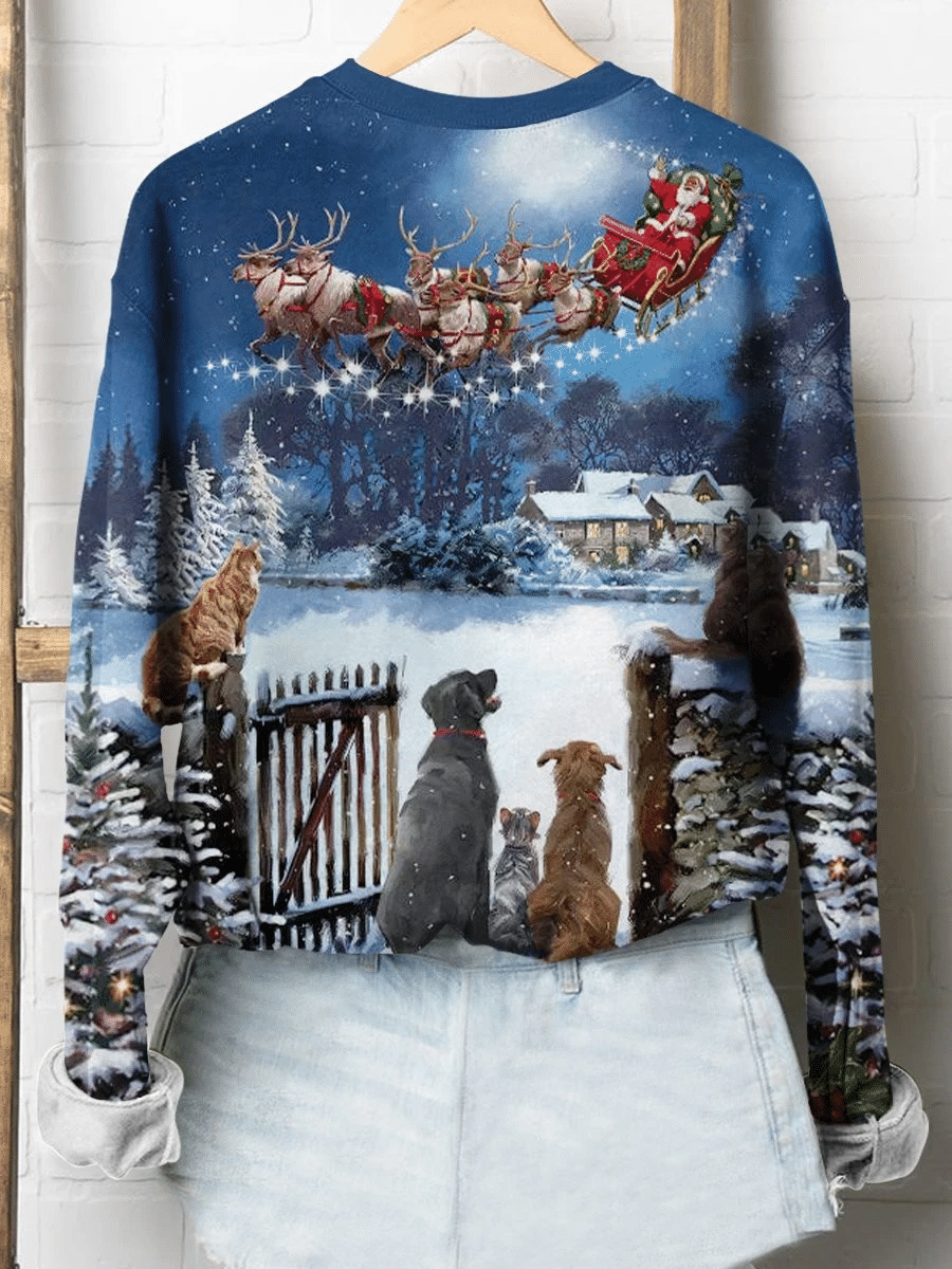 Cats And Dogs Watching Santa Christmas Print Long Sleeve Sweatshirt