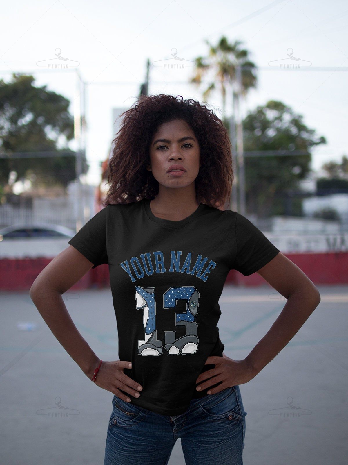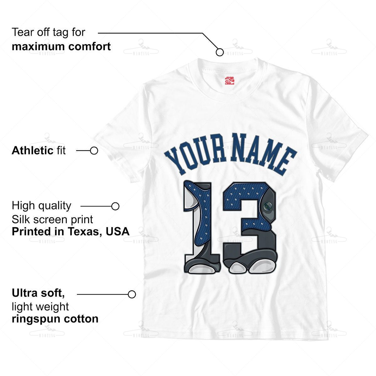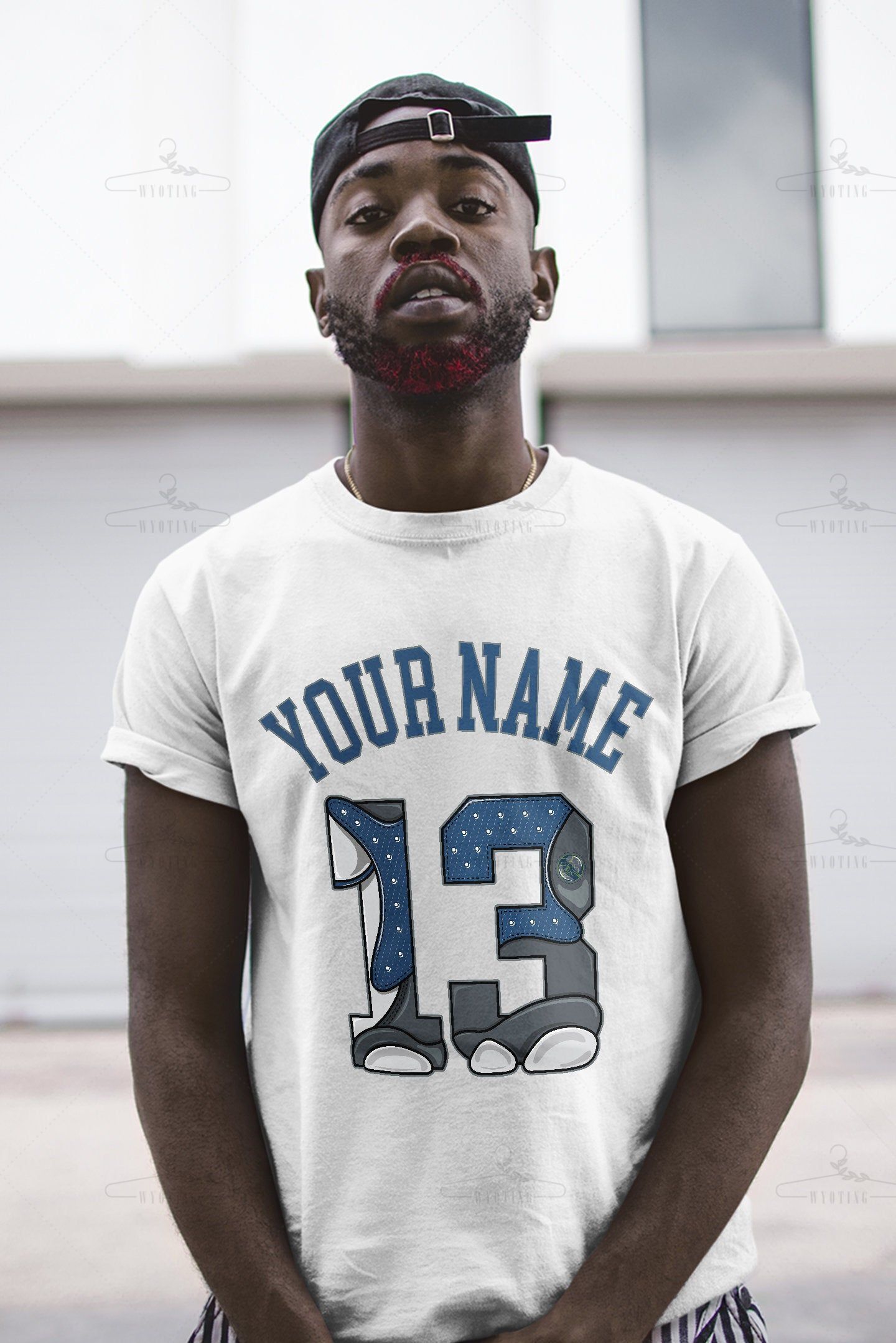 Customized Name / Number 13 Unisex Shirt Match Jordan Retro 13 Flint Navy White French Blue