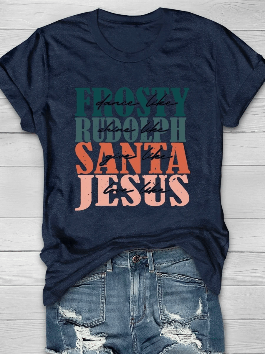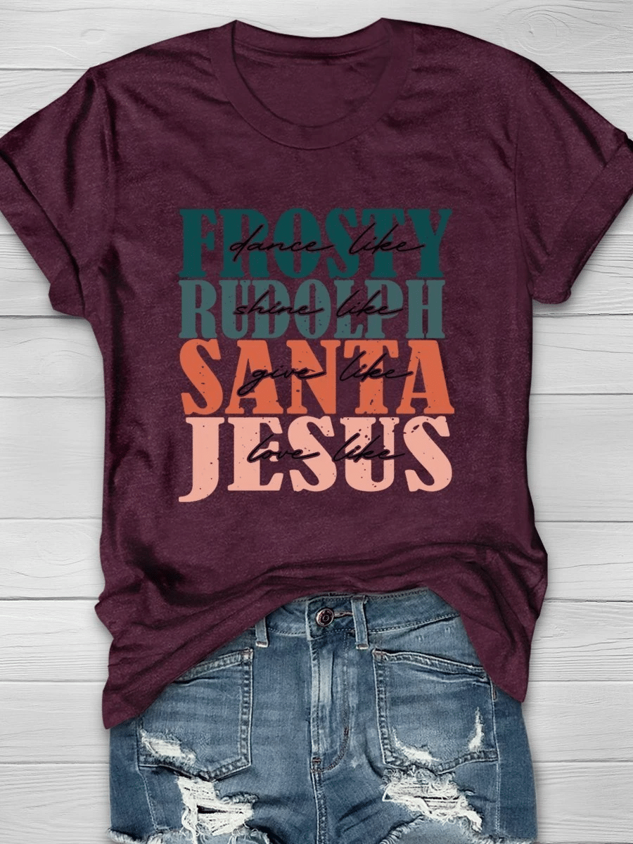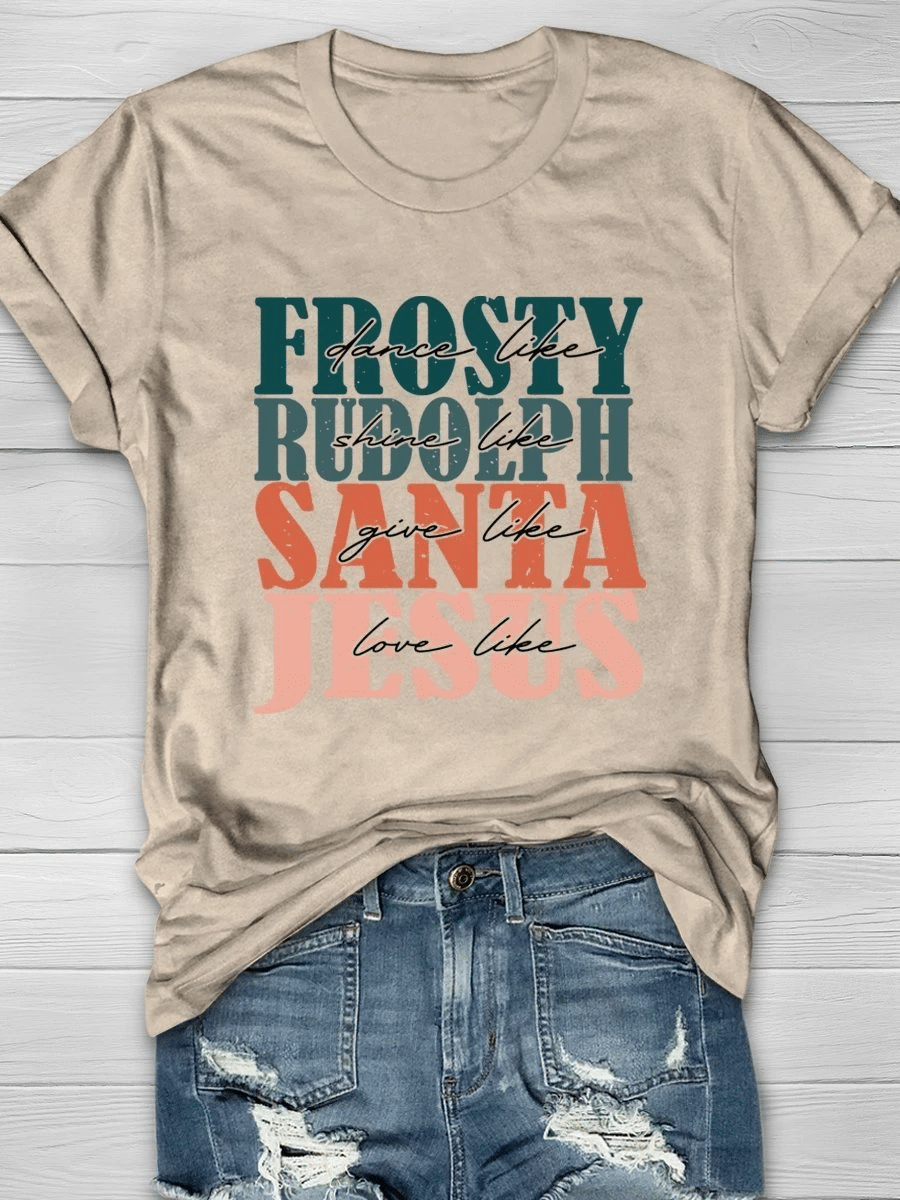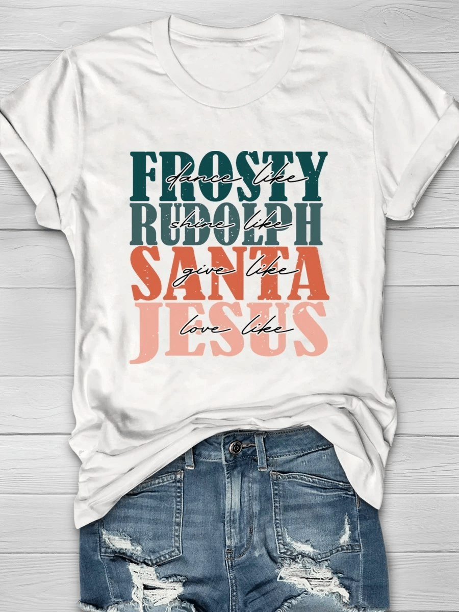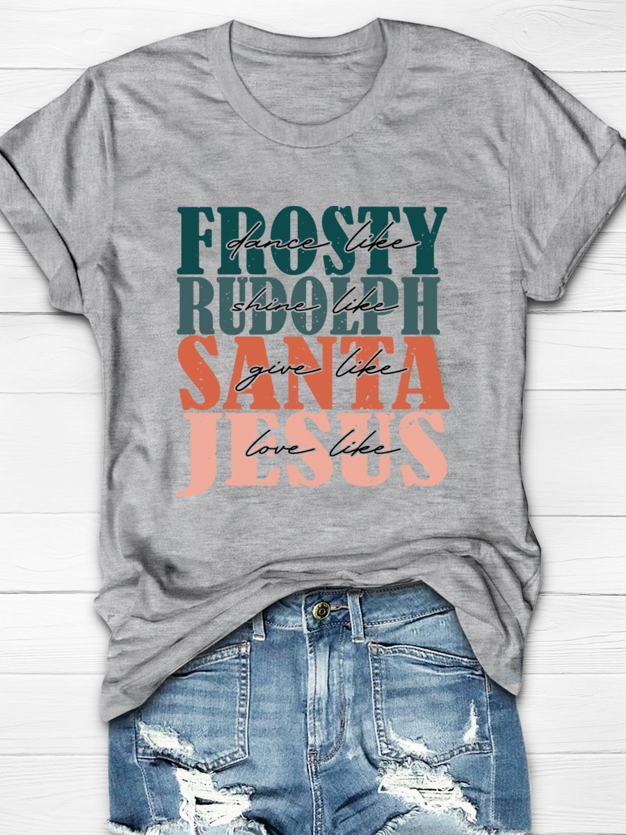 Dance Like Frosty Shine Like Rudolph Give Like Santa Love Like Jesus Christmas Print Short Sleeve T-Shirt