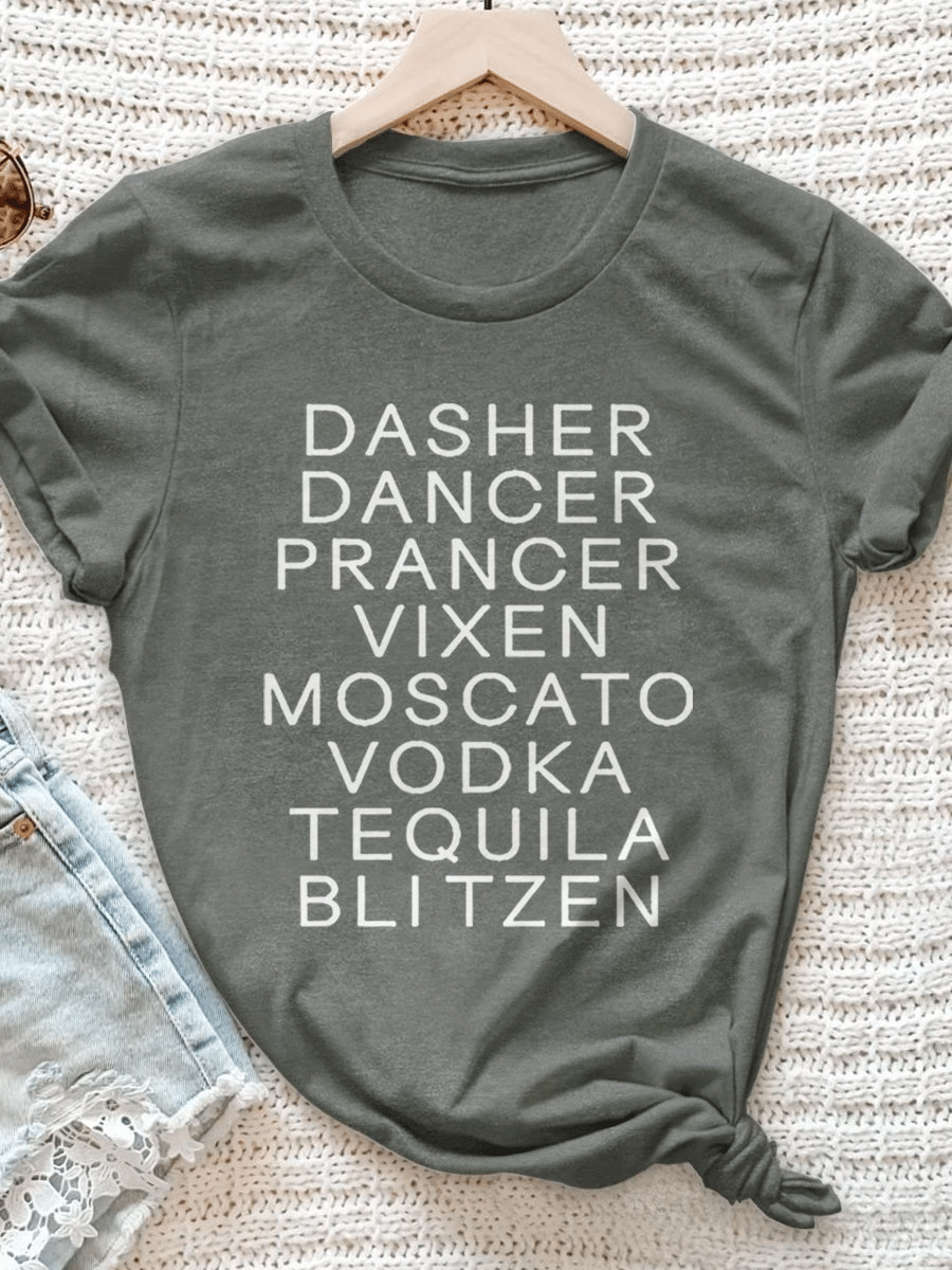 Dasher Dancer Prancer Vixen Moscato Vodka Tequila Blitzen Christmas Print Short Sleeve T-Shirt