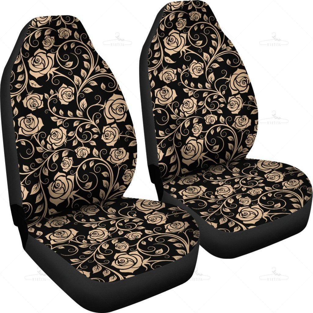 Gold Tan Roses Floral Flowers Black Car Seat Covers Pair, 2 Front Car Seat Covers, Seat Cover For Car, Car Seat Protector, Car Accessory