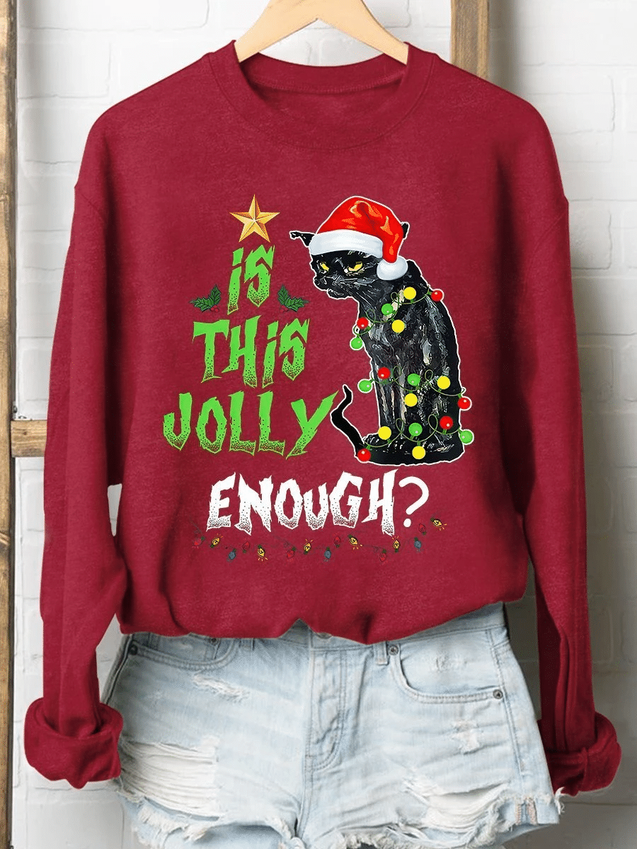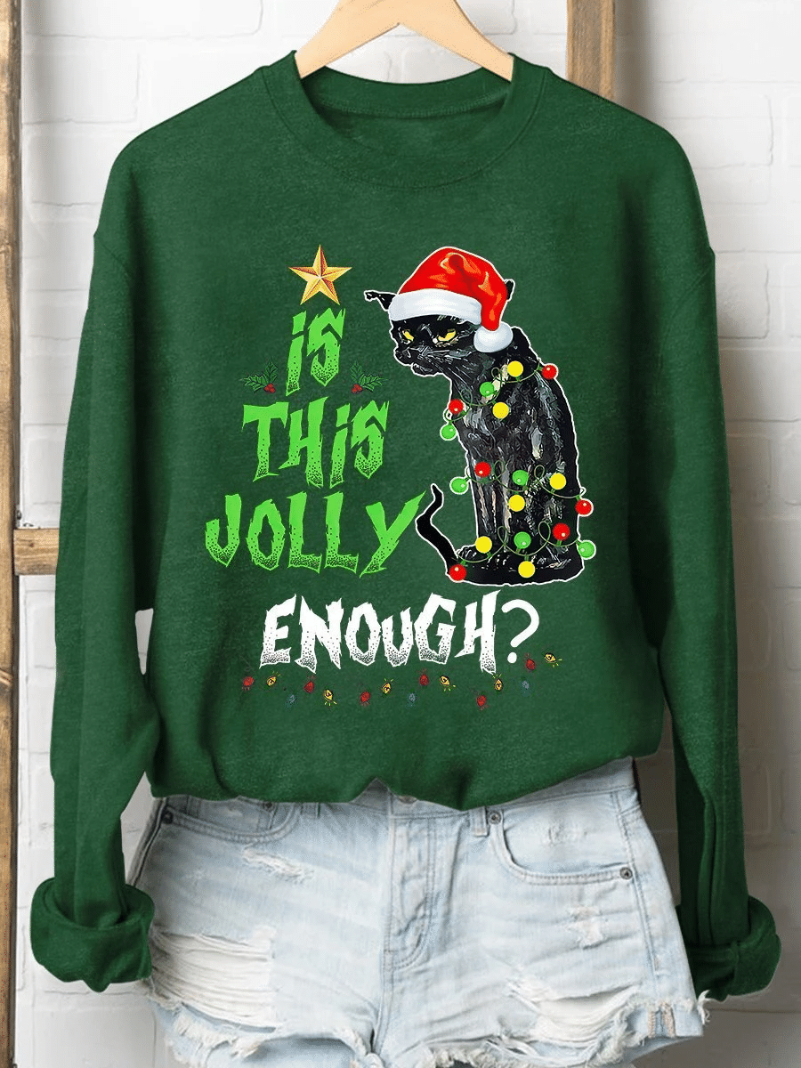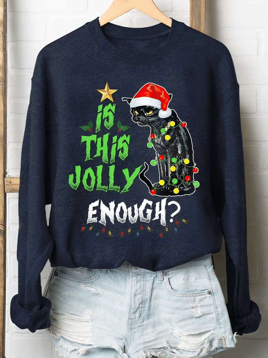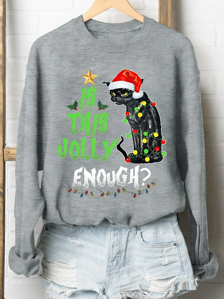 Is This Jolly Enough Noel Cat Merry Christmas Print Long Sleeve Sweatshirt