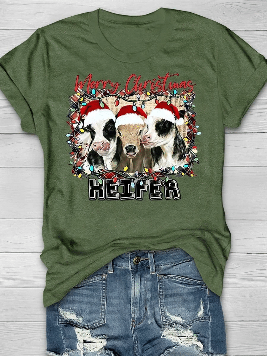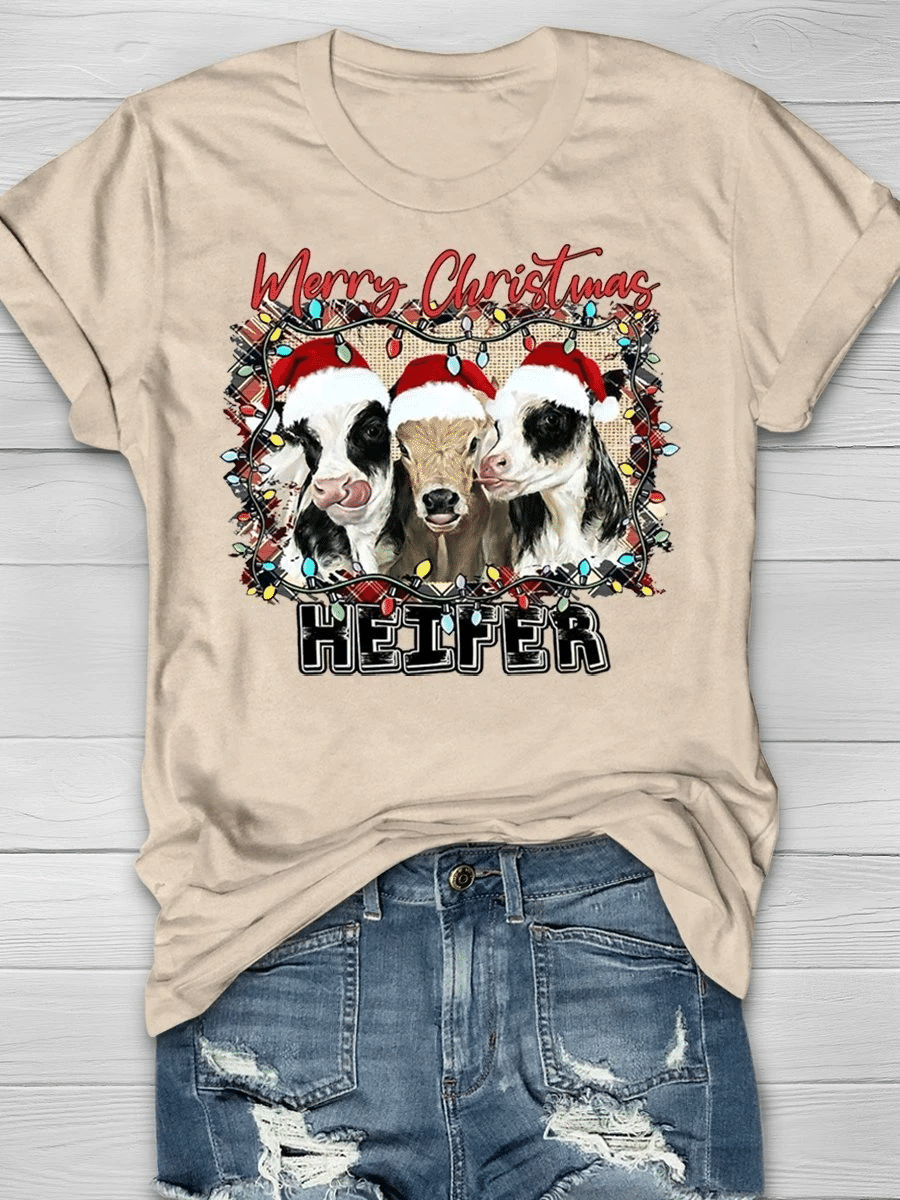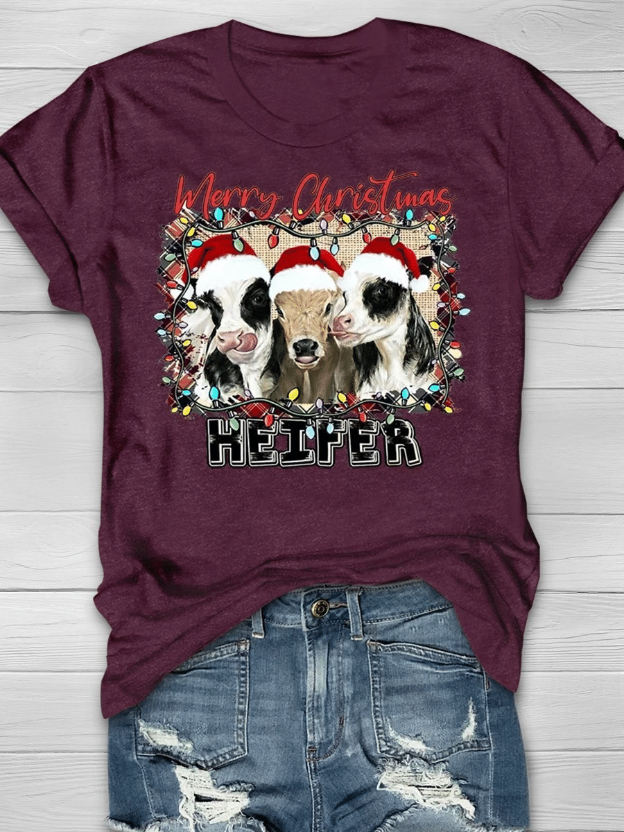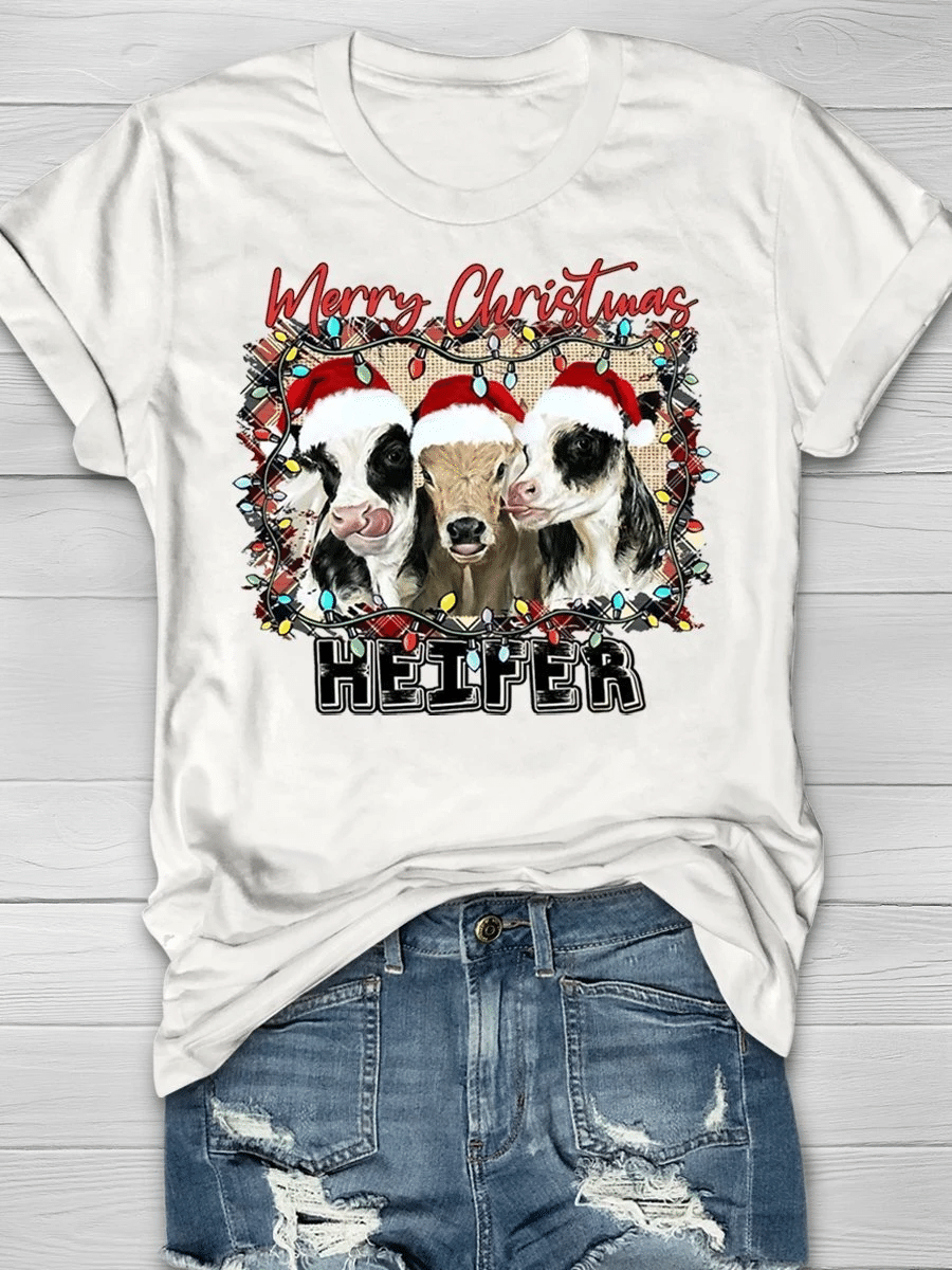 Merry Christmas Heifer Print Short Sleeve T-Shirt