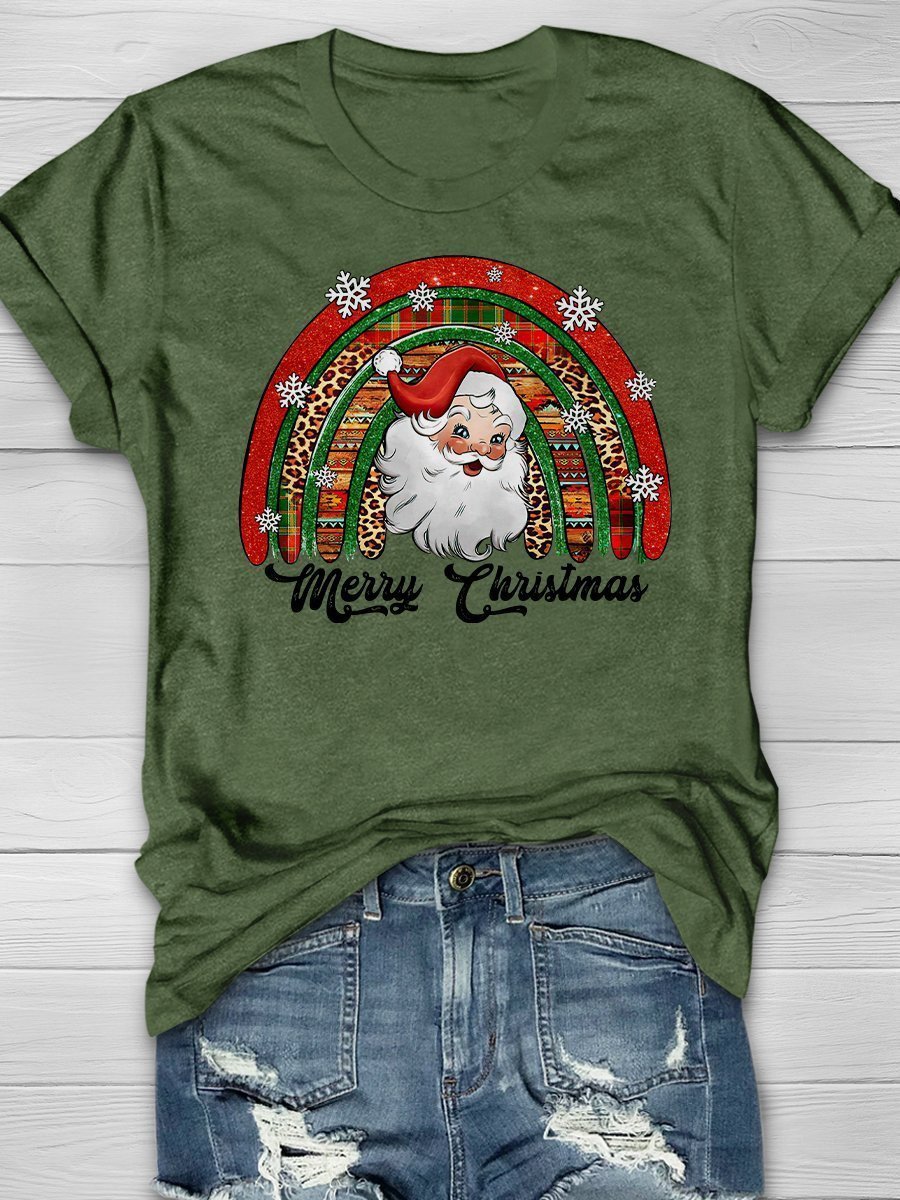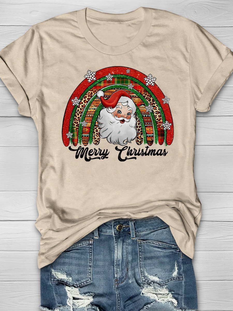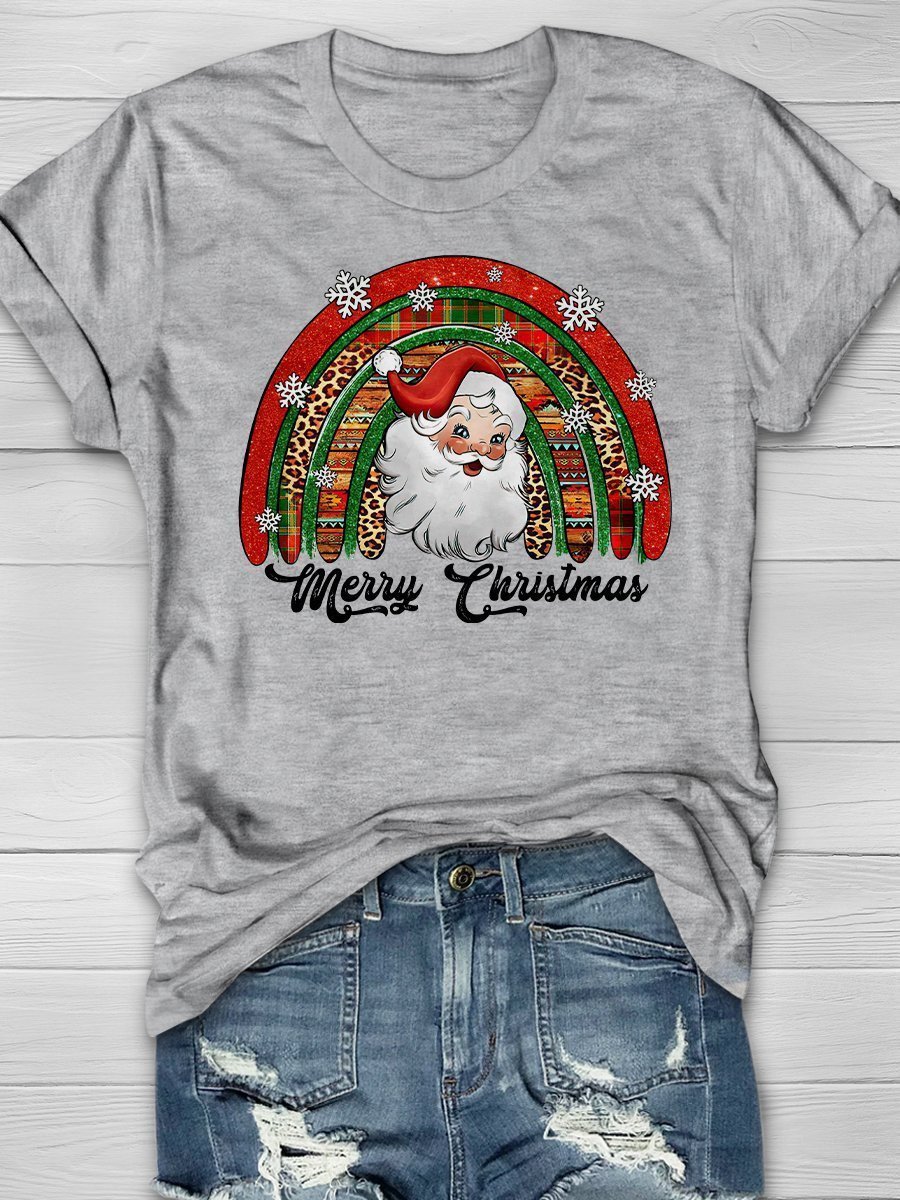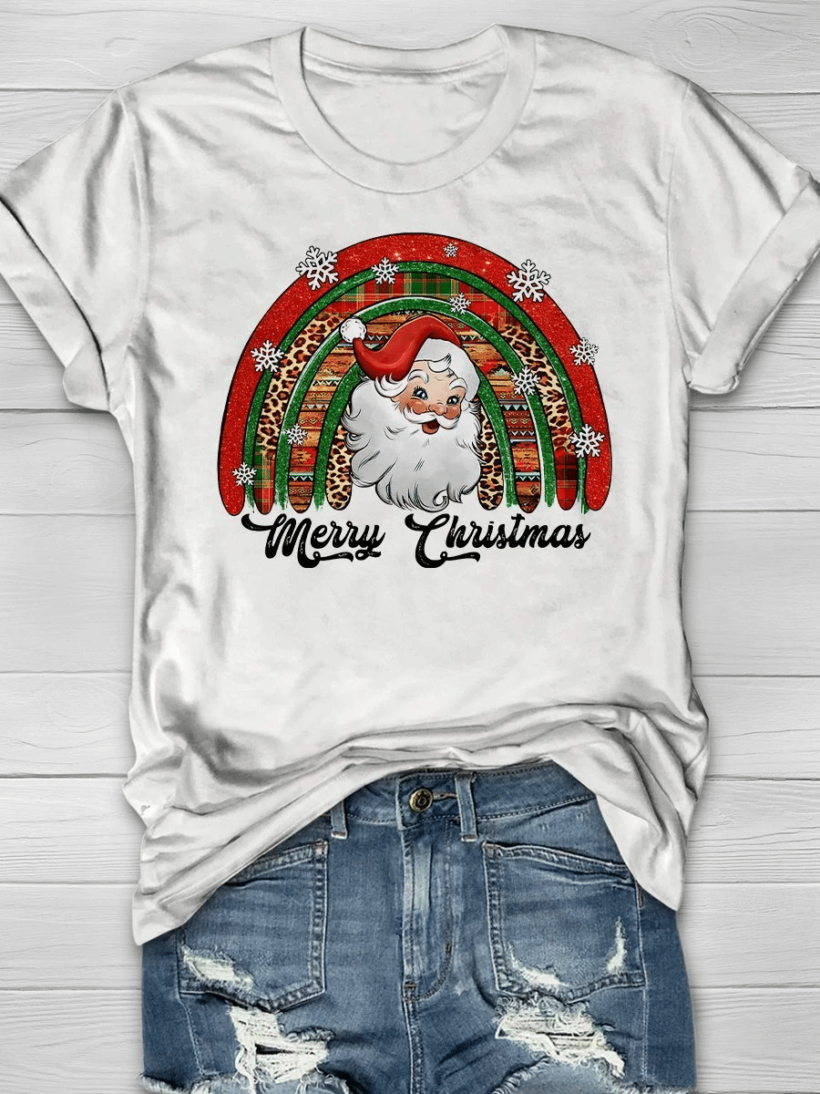 Merry Christmas Santa Snowflake Rainbow Print Short Sleeve T-Shirt