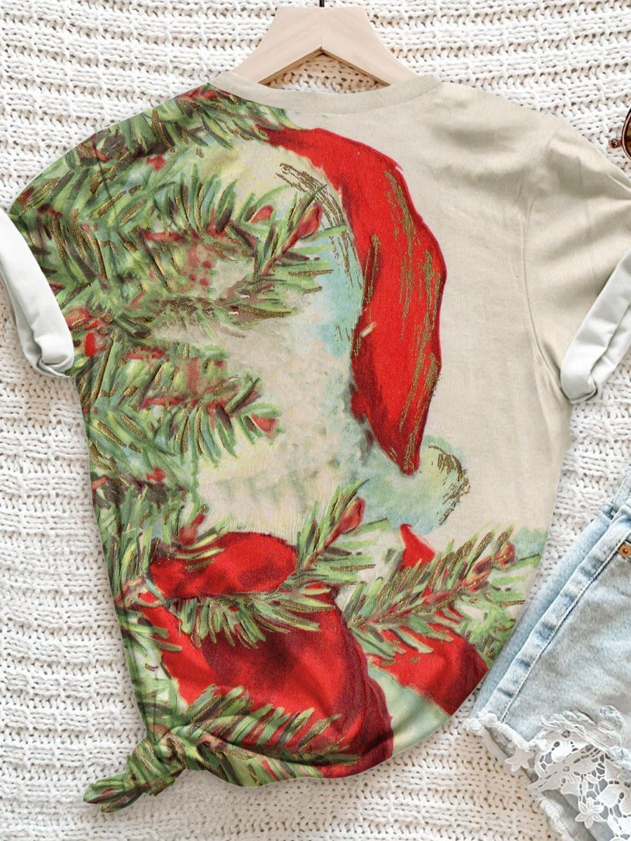 Santa Claus And Christmas Tree Vintage Print Short Sleeve T-Shirt