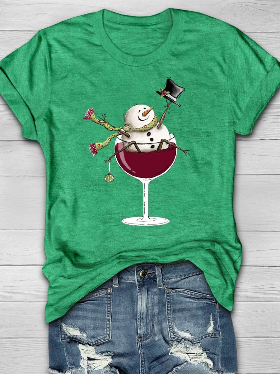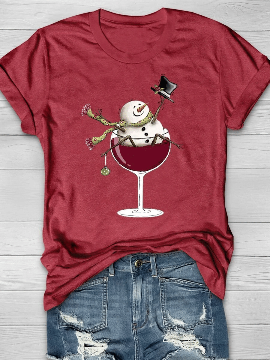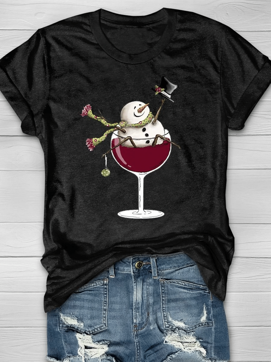 Snowman Wine Glass Print Short Sleeve T-Shirt