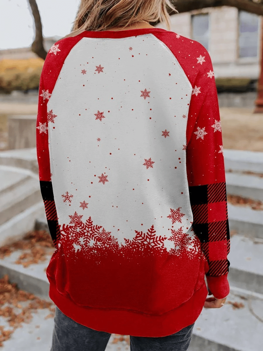 Snowy Santa Christmas Red Plaid Snowflake Print Long Sleeve Sweatshirt